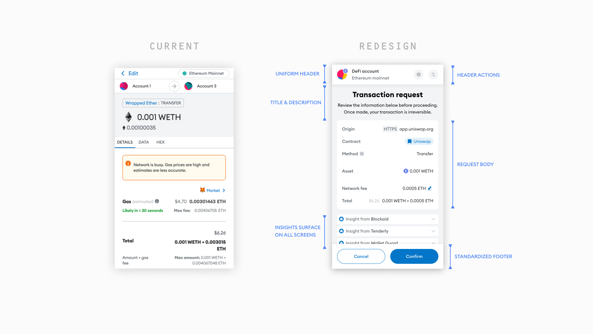 80 million monthly users make MetaMask the most popular crypto wallet in the Web3 ecosystem. I led the initiative to prioritize consent during transactions, worked on prioritizing usability improvements related to security and privacy, and worked on the new generation of Ethereum accounts.