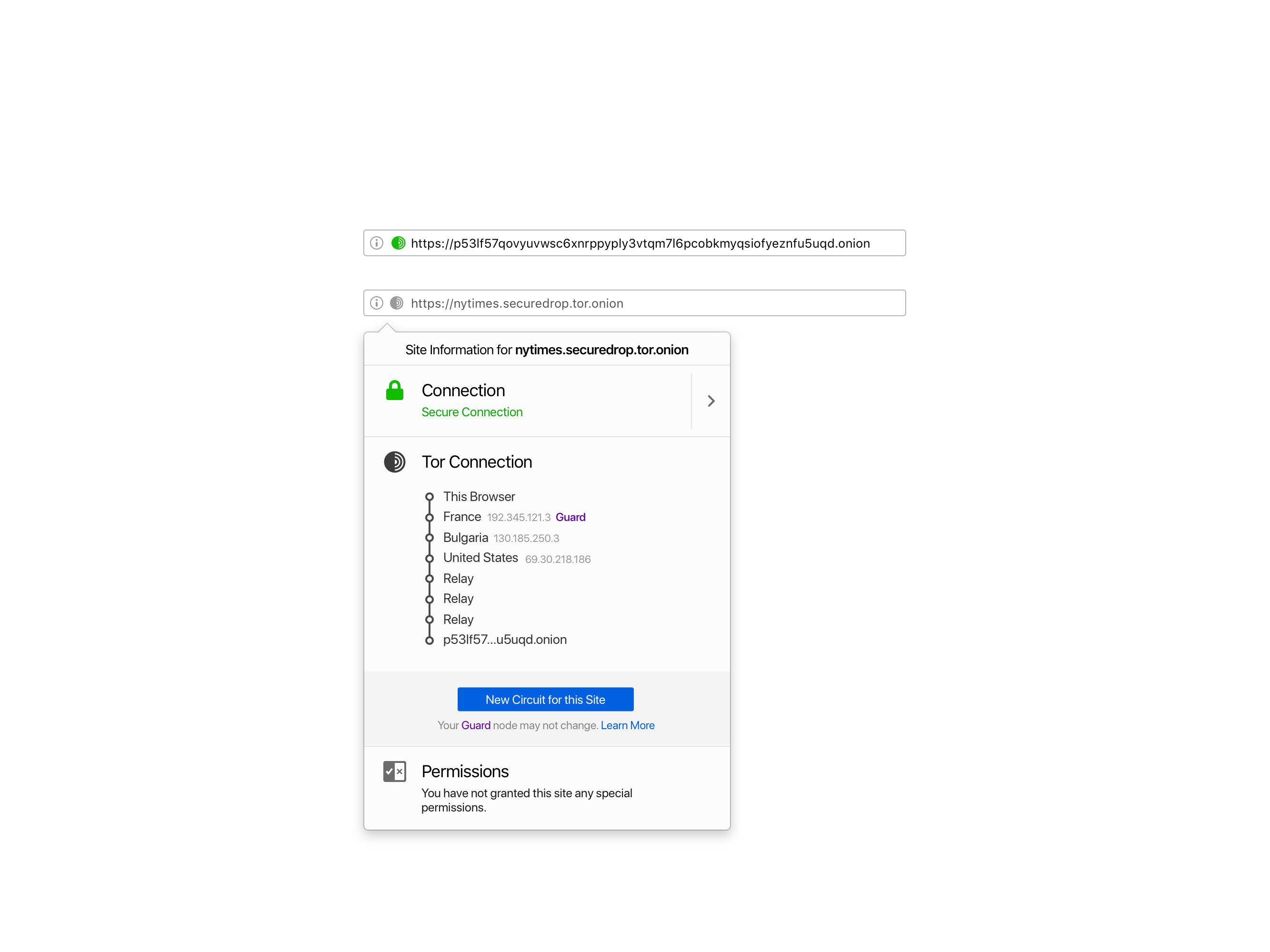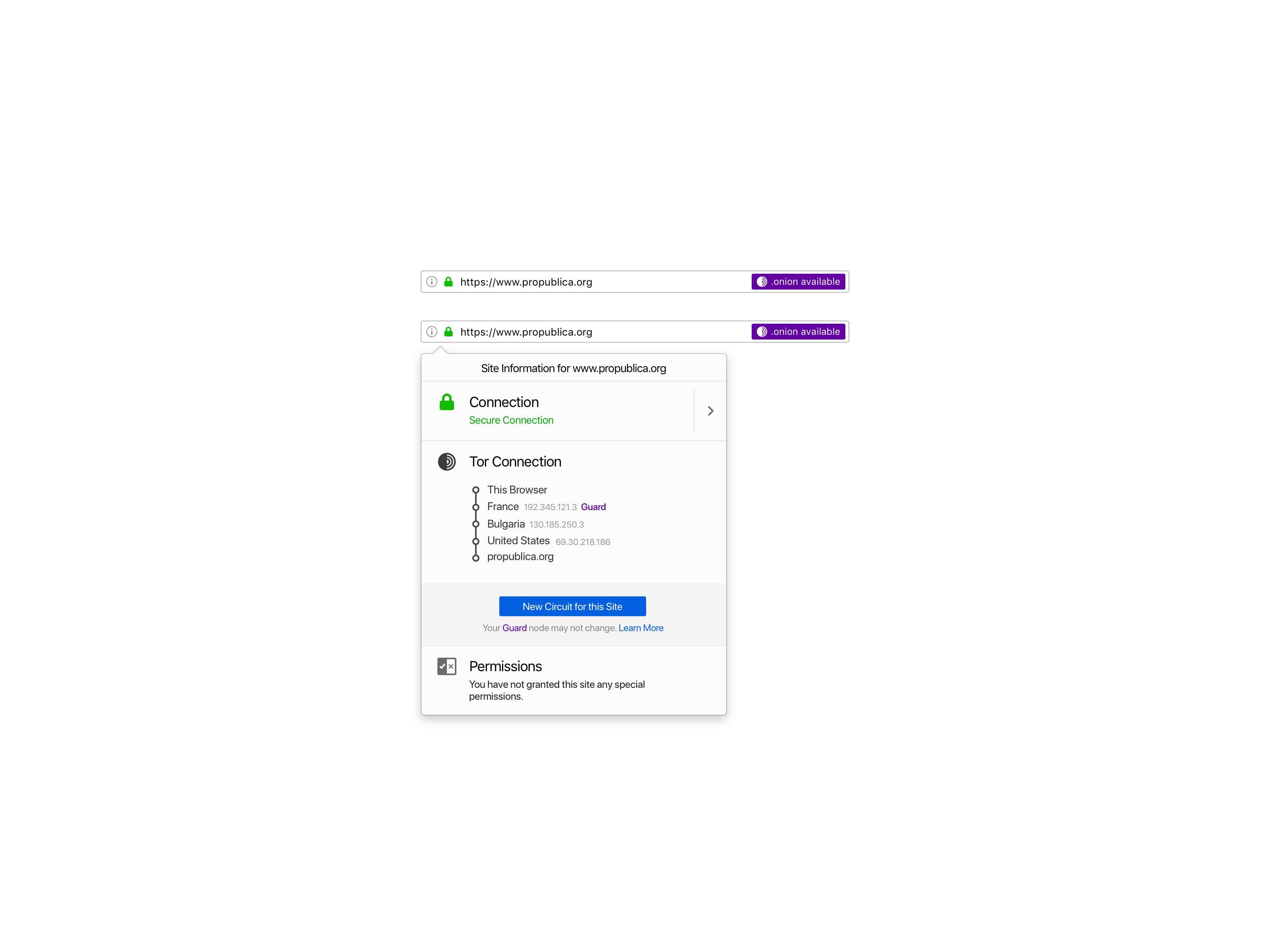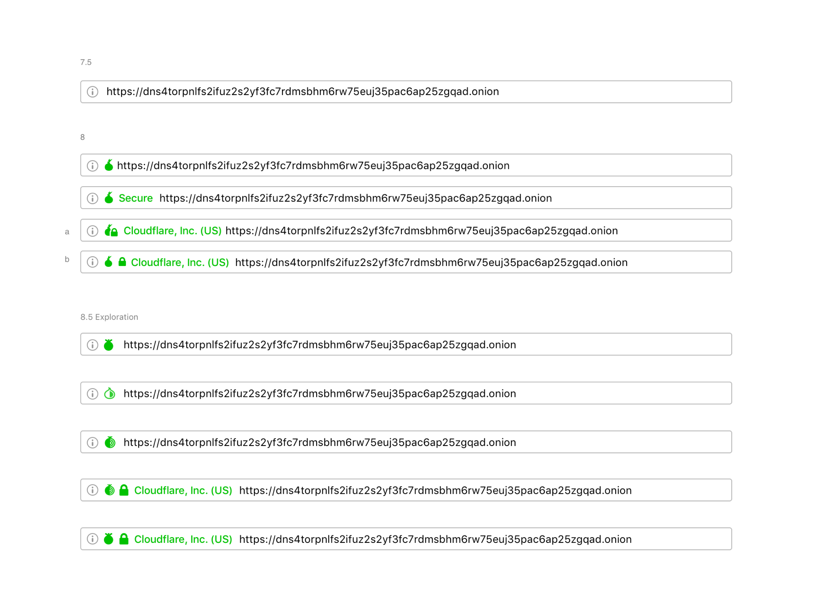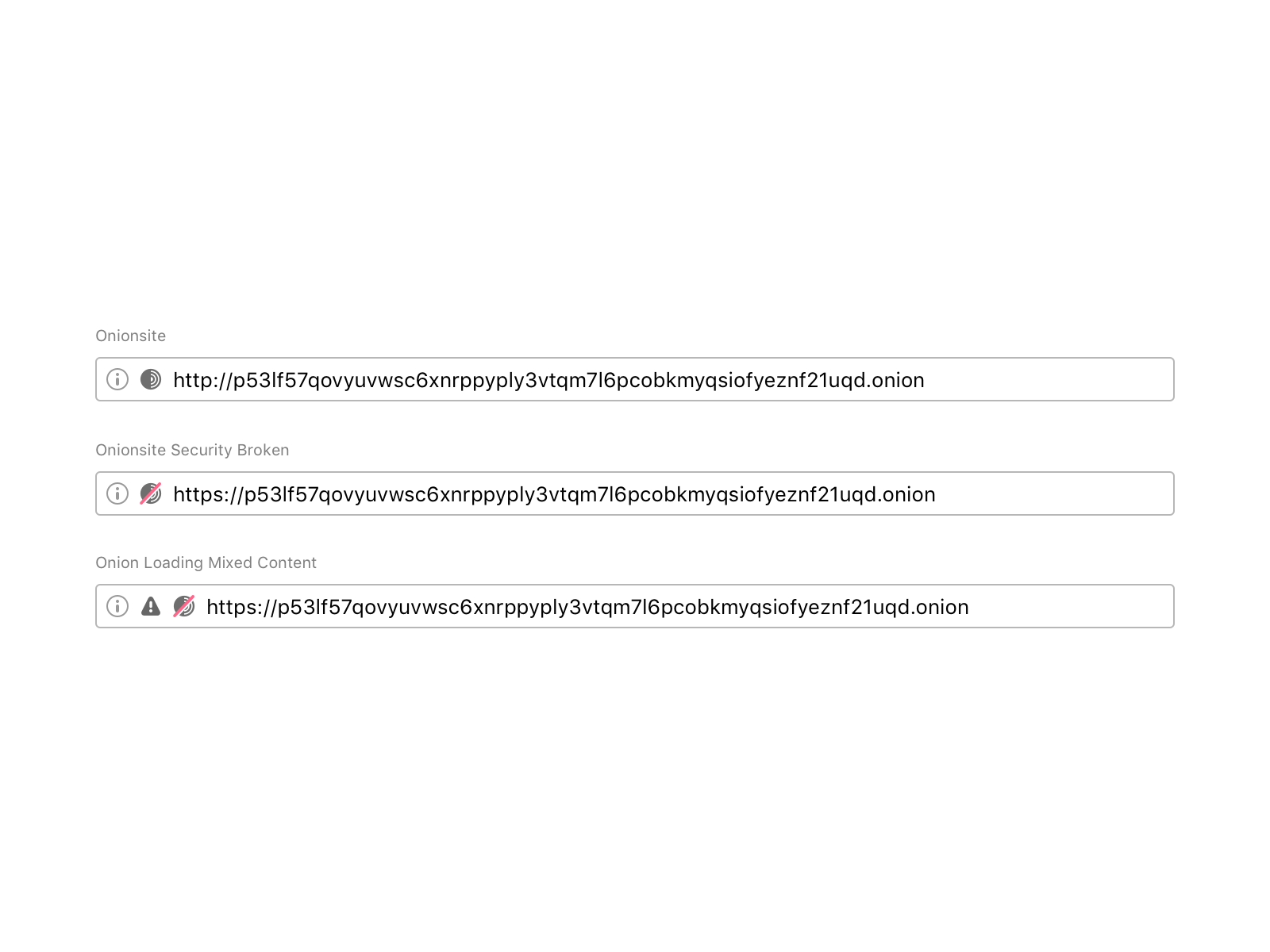 Major browsers iterated the formerly green icon for secure SSL to gray, intending to de-emphasize the default (safe) connection state and, instead, put more emphasis on broken or insecure connections. We understood that it was a benefit for the entire user base if we deployed experiences that are already familiar to users. So, we updated the colors of the Tor Browser security indicators to make it easier for users to understand when they are visiting a non-secure website by following the standard SSL approach. We also decided to use an abstract onion to help users identify when the site they are visiting is an onion service.