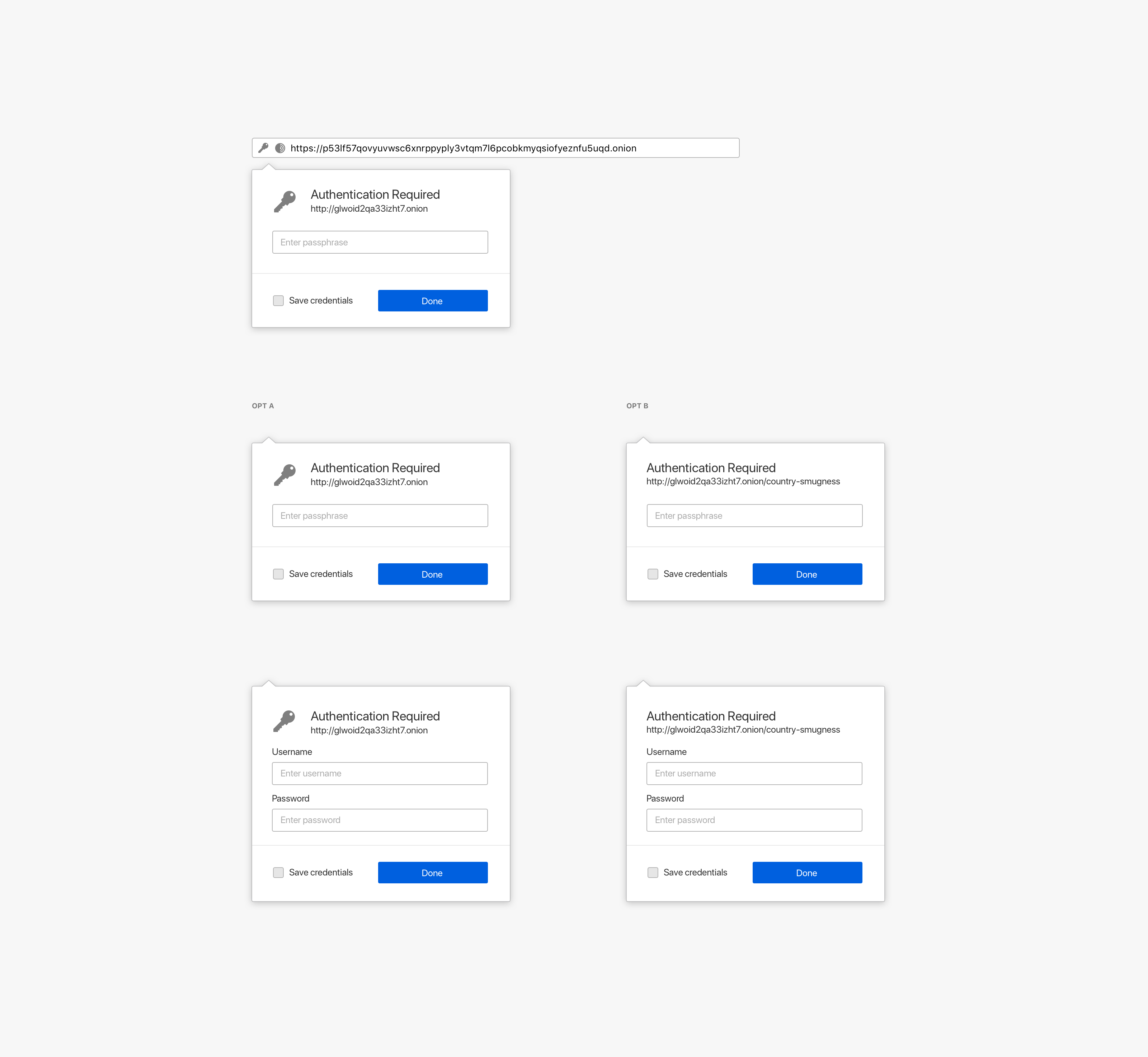 Onion services can add an extra layer of security by providing users with a password to access them. The first iteration of this experience was using a standard HTTP authentication user flow. We iterated it to allow users to save their onion password in their local logins.